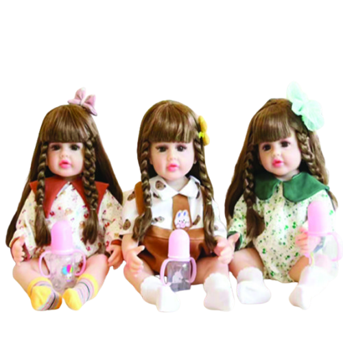 בובה תינוקת מעוצבת בצורה ריאליסטית עם פנים חמודות, בגדים עדינים ופרטי אבזור כמו בקבוק, מוצץ או כובע.